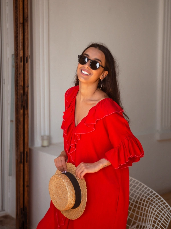 Réalisé en lin rouge intense, il séduit par ses manches à volants qui ajoutent une touche de féminité et de mouvement.