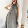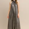 Robe maxi argenté, très fluide et ample, elle s’adapte parfaitement à toutes les silhouettes.