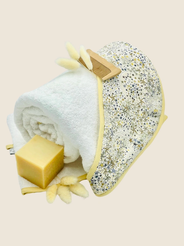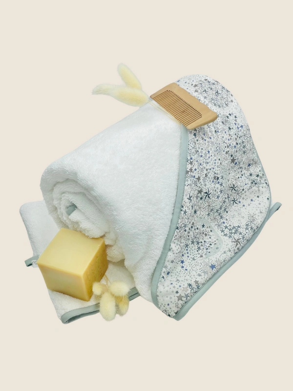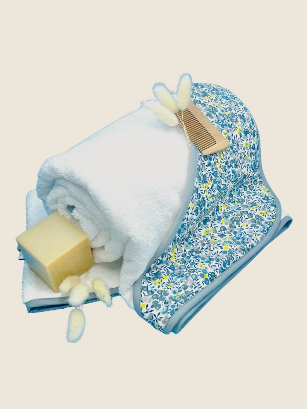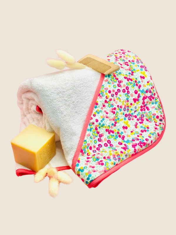 Avec son éponge moelleuse et sa capuche doublée de tissu liberty d’une extrême douceur, cette sortie de bain accompagnera votre enfant de la naissance jusqu’à ses 3 ans.