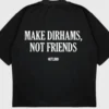 T-shirt noir oversize avec l’inscription audacieuse “MAKE DIRHAMS, NOT FRIENDS” au dos, un style urbain qui reflète l’esprit d’ambition et d’indépendance.