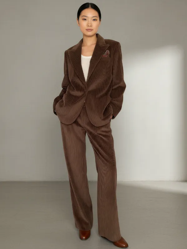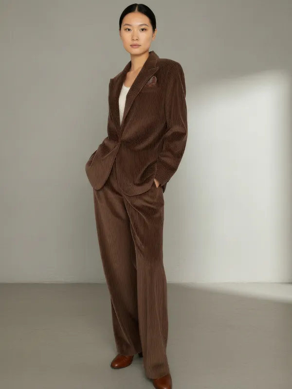 Confectionné dans un velours côtelé souple, le tailleur MARVIN offre un tombé fluide tout en conservant une belle structure. La matière capte la lumière avec subtilité et accompagne les mouvements du corps avec aisance, pour un confort qui ne sacrifie jamais le style.
