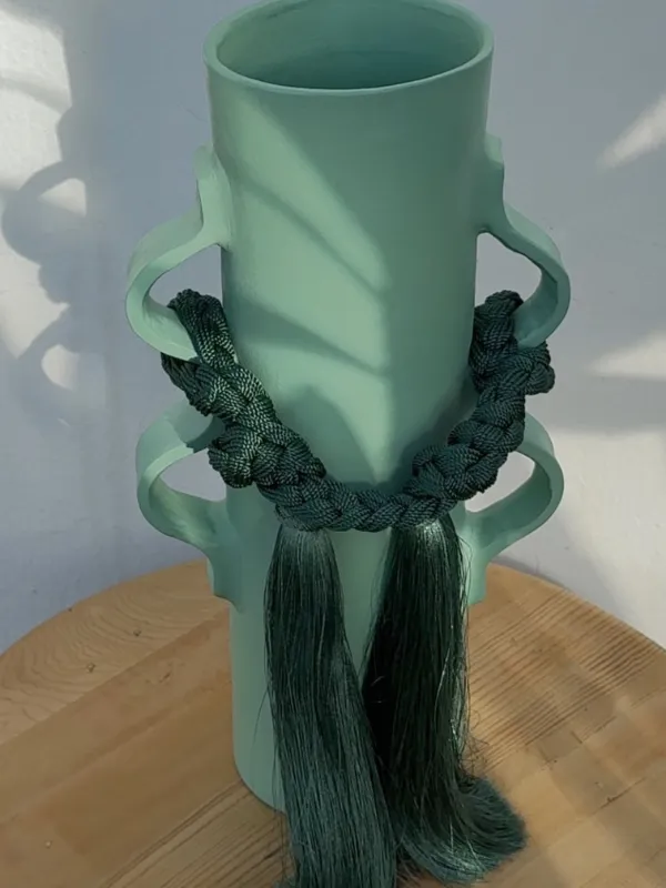 Le Majdoul Vase joue avec les contrastes : une silhouette élancée ponctuée de courbes sculpturales et un cordage tressé ton sur ton, prolongé de longs pompons.