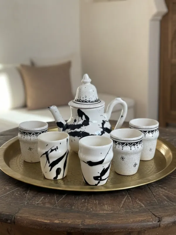 Plongez dans l'expérience ultime du thé marocain avec notre pack exclusif comprenant une théière en céramique, 6 verres, le tout rehaussé avec un splash noire et d'un design éclatant.