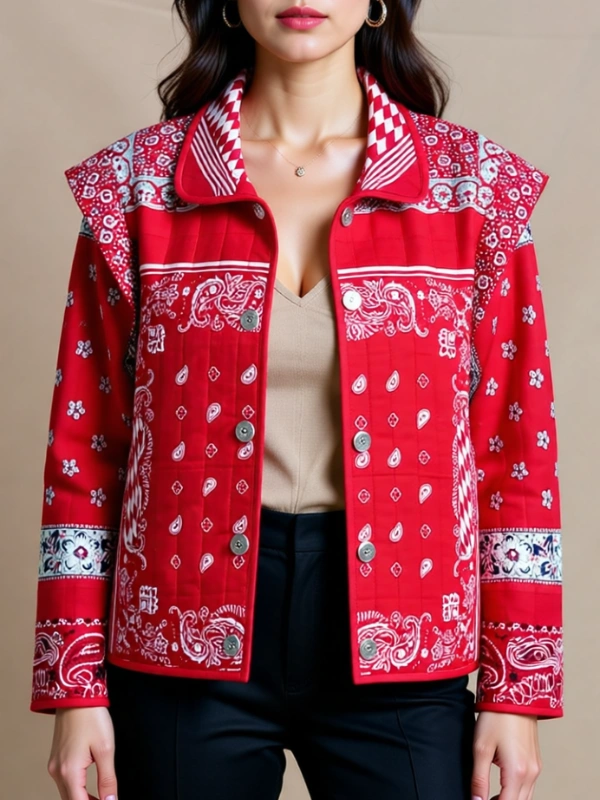 Cette veste bandana rouge réinvente l’iconique motif paisley dans une version moderne et affirmée. Sa couleur rouge vibrante est rehaussée de détails blancs et noirs, ainsi que d’un col contrasté à motifs géométriques pour une touche originale.