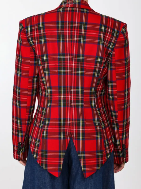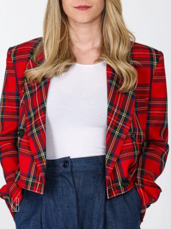 Confectionné dans un tissu tartan rouge lumineux, il affirme un style fort, entre héritage et modernité.